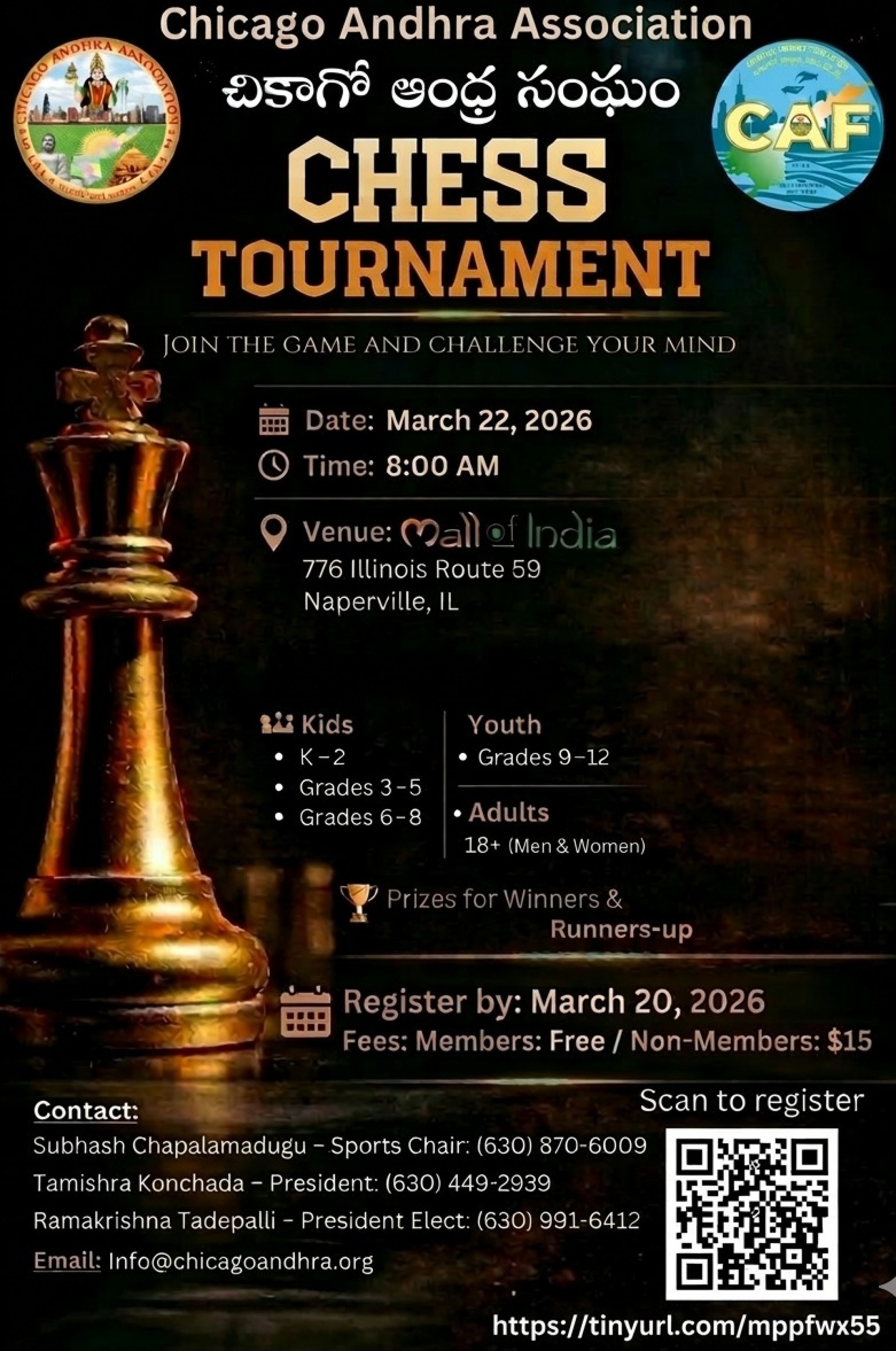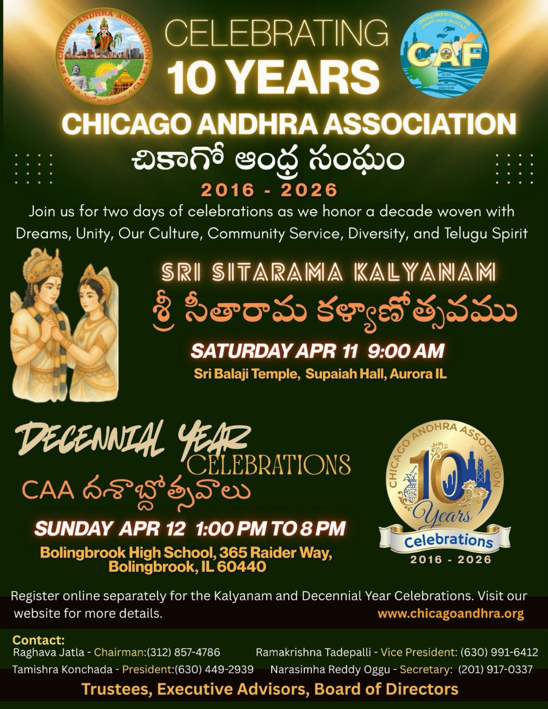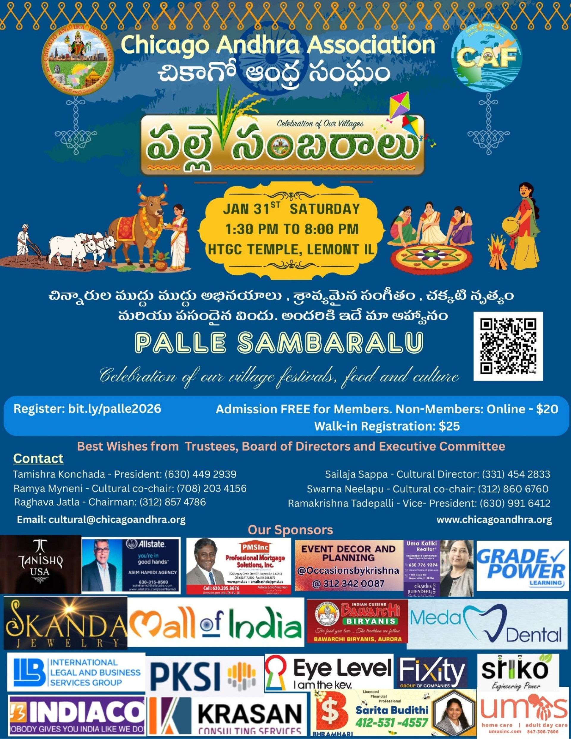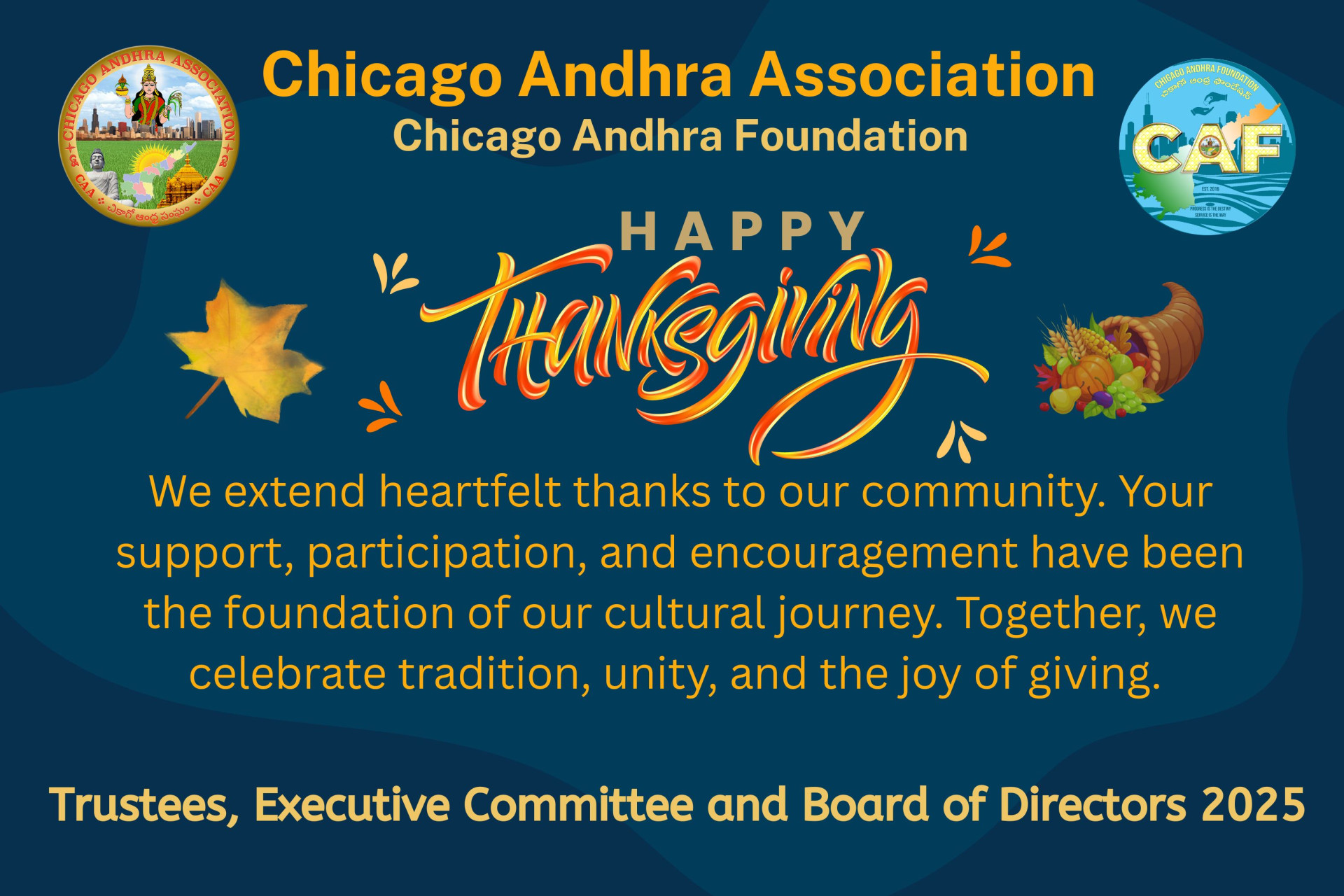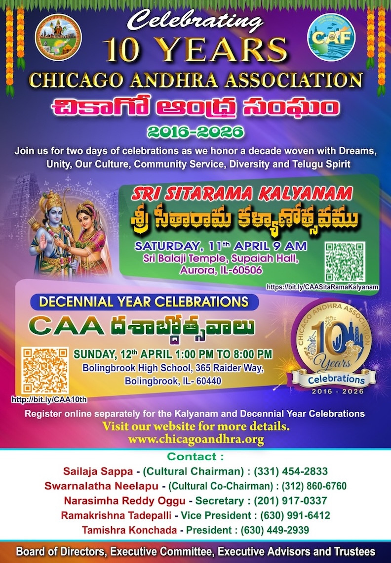 The Association was originally founded in 2016 and incorporated as a 501C3 Non-profit organization. CAA's primary objective is to support development in Andhra Pradesh and celebrate our culture in Chicago area. As a part of development and celebrating culture, CAA membership is open to all who have common interests. As a dedicated Andhra Pradesh oriented organization in the Chicago land area, CAA is actively involved in various local community events along with development effort in Andhra Pradesh.