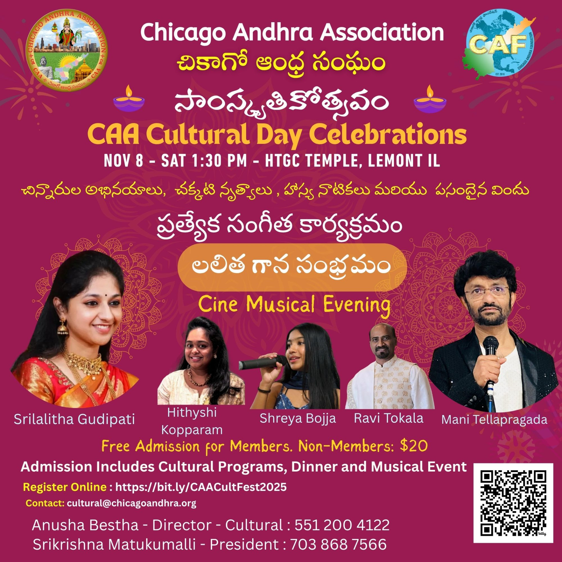 Chicago Andhra Association (CAA) is a non-profit organization devoted to the awareness, promotion and development of South Asian bifurcated Indian southern state Andhra Pradesh and supported by the interested people irrespective of region and ethnics living in the United States headquartered in Chicago metro area.
